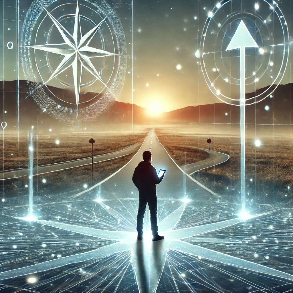 An AI-generated image depicting an individual standing at a crossroads, staring at a digital map, symbolizing guidance, goal setting, and the journey ahead. OpenAI. (2024). ChatGPT [Large language model]. https://chatgpt.com