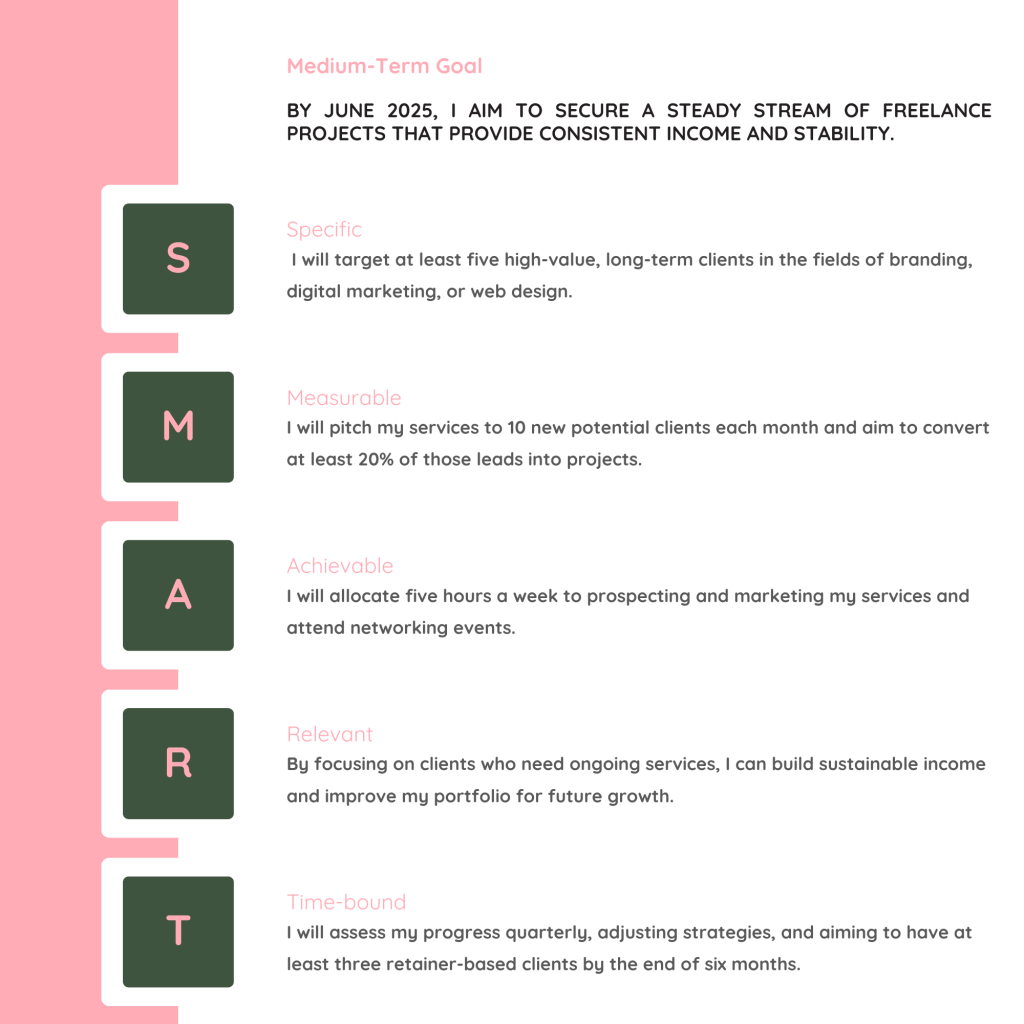 My new SMART goal is to build a foundation of stability by November 2025. This includes targeting five high-value clients for ongoing branding, digital marketing, or web design services and converting 20% of leads each month. Despite my demanding schedule, I’ll allocate five hours weekly to prospecting and marketing through platforms like LinkedIn and Upwork. Securing three retainer-based clients within a year will put me on track for sustainable growth.